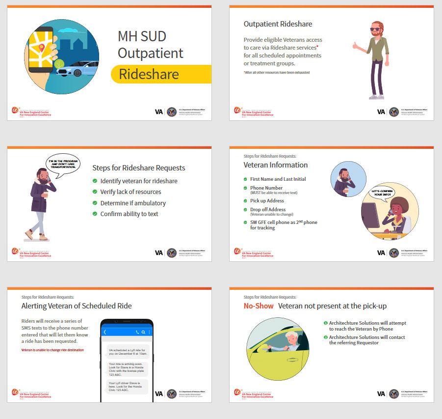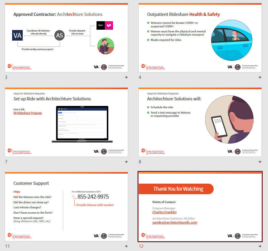For this project, I converted a text-heavy PowerPoint into an engaging, understandable, character-based presentation. The purpose was to support live training for employees who schedule rideshares for veterans.